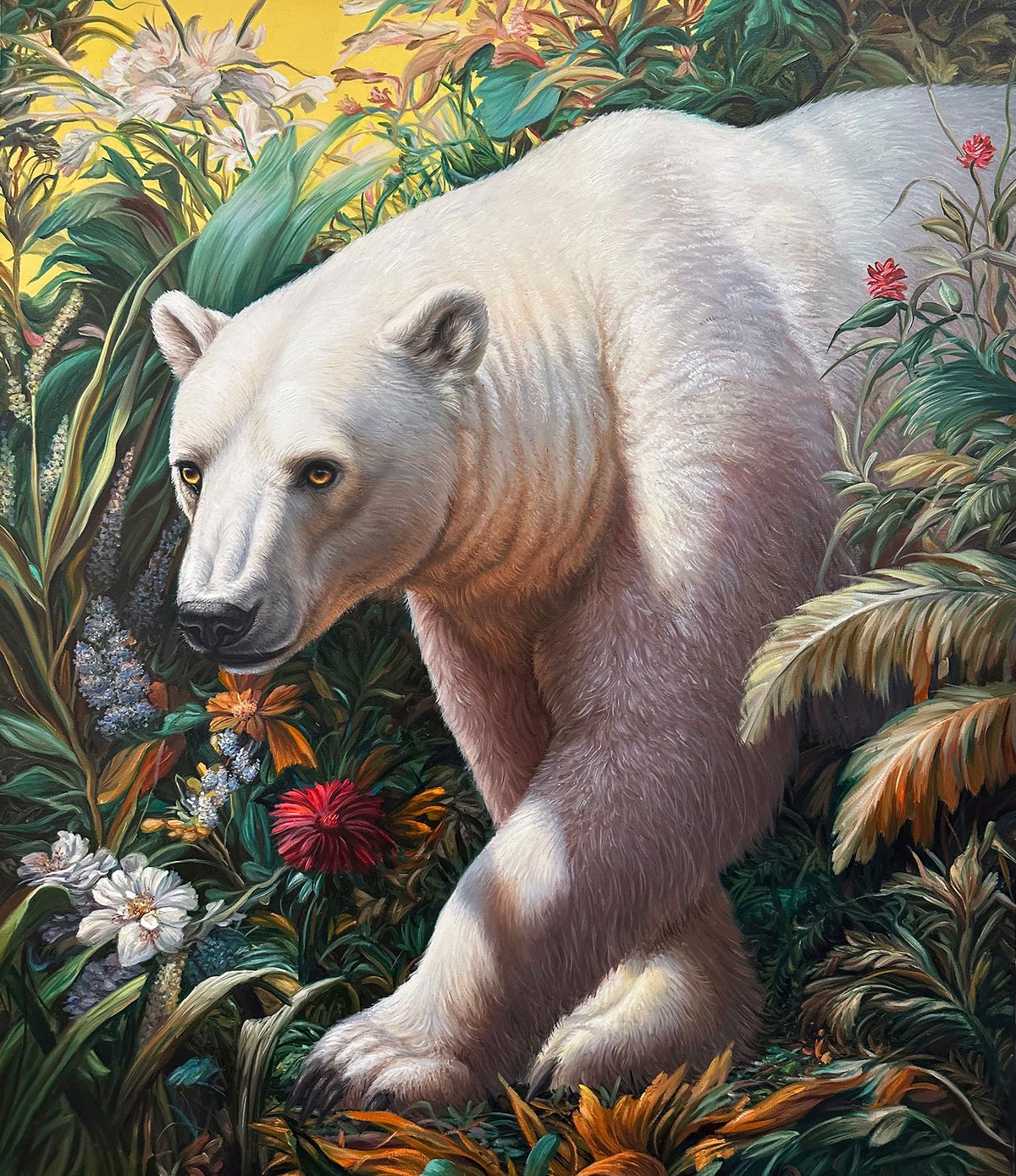 Absolute Elsewhere er Angela Grams fjerde soloudstilling hos Gallery Poulsen. Med denne nye serie malerier undersøger hun samtidens mest radikale videnskabelige eksperimenter, globale magtbalancer og klimaforandringer, formidlet gennem naturens og de vilde dyrs symbolske sprog.
