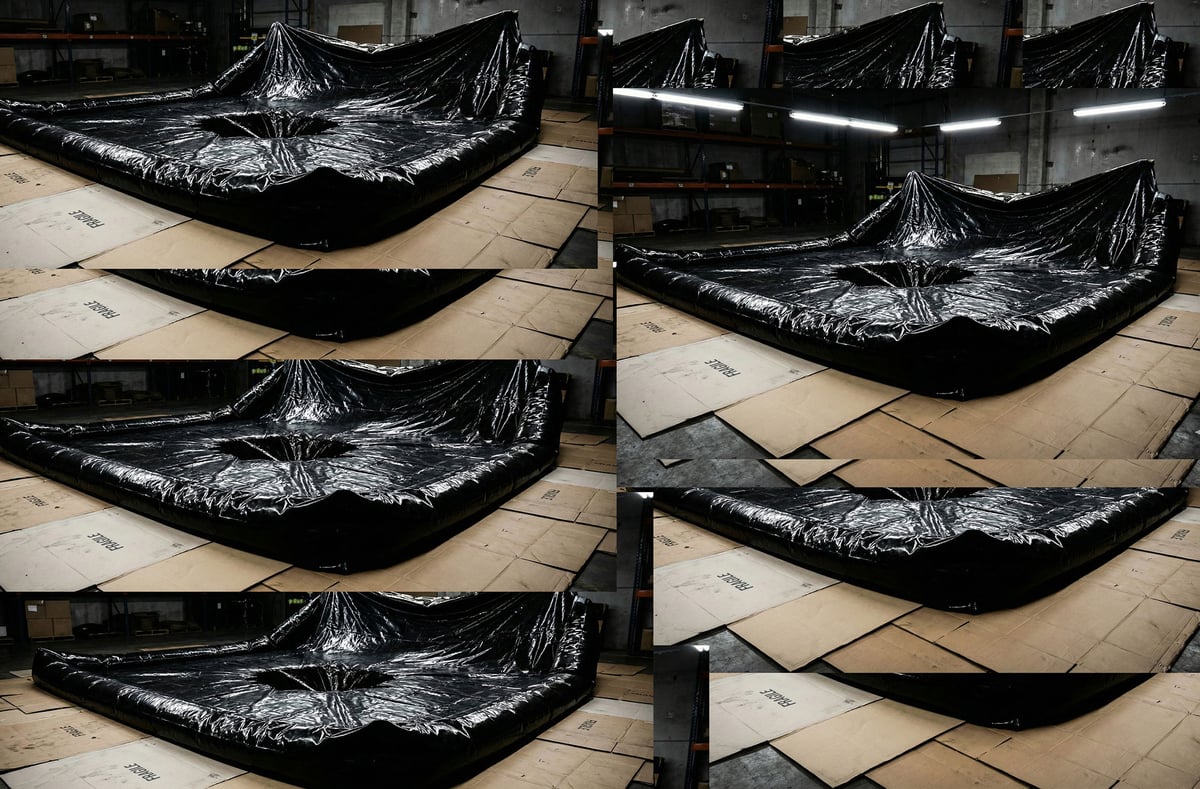 De oppustelige strukturer, støbt i sort polyurethanharpiks, fremstår både som tærskel og organisme. De antyder passage, men også afspærring. Overfladerne er industrielle og præcise, mens formerne stadig bærer spor af oppustningens bevægelse — udvidelse og tryk.