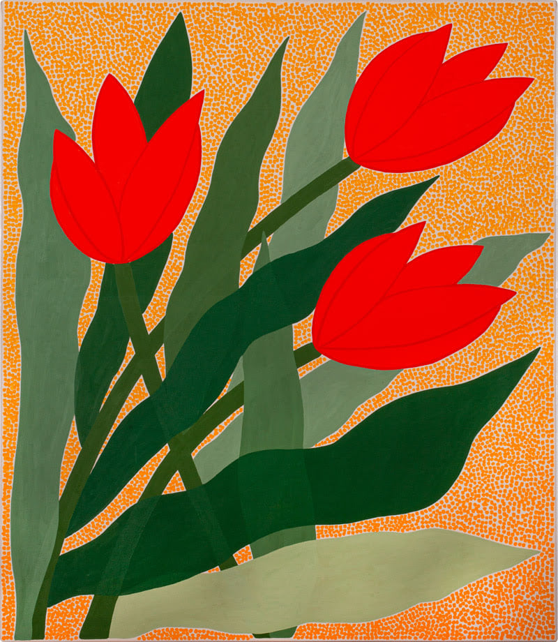“Tulipanen er ikke en uskyldig blomst, og det gør den sjov at male. Det er en industriel blomst, der produceres i de våde, flade landområder i Holland. I Amsterdam, hvor jeg tilbragte mine 20'ere, er blomsten ikke bare en blomst, men også et nationalt symbol – et ironisk symbol, da den rummer historien om en af de største markedsspekulationer i økonomisk historie, der førte til panik og fortvivlelse. For mig er den et godt spejl af den tid, vi lever i, hvor det er de mærkeligste ting, der tillægges værdi.”