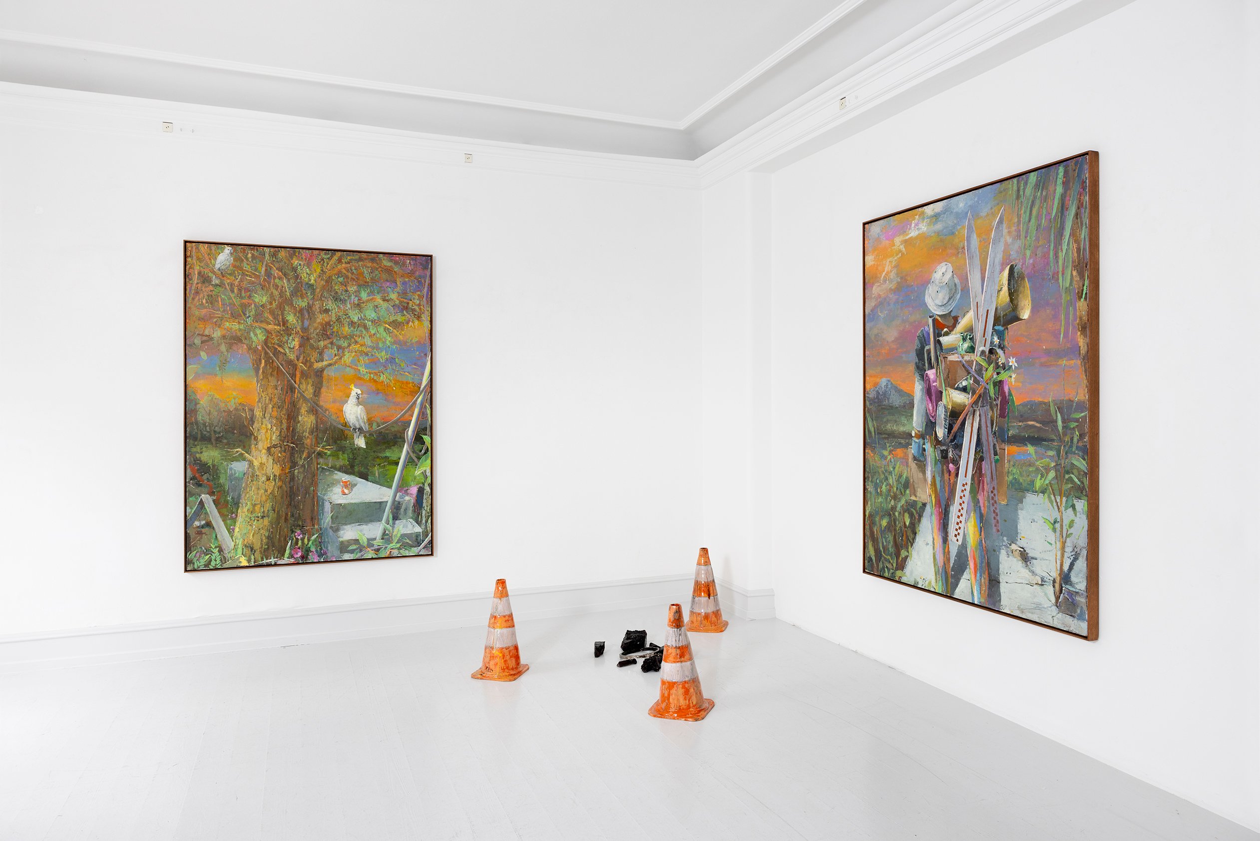 In our misdirected age it seems a rare immunity to wan- der abroad without an allocated or determined sense of final destination. Yet as the figures in the current series of Fritz Bornstück paintings sojourn on arrested journey or a voyage into nature, at the same time they carry with them the material accretions of the world, the used, abused, and abject consumer objects that they might reasonably have left behind.