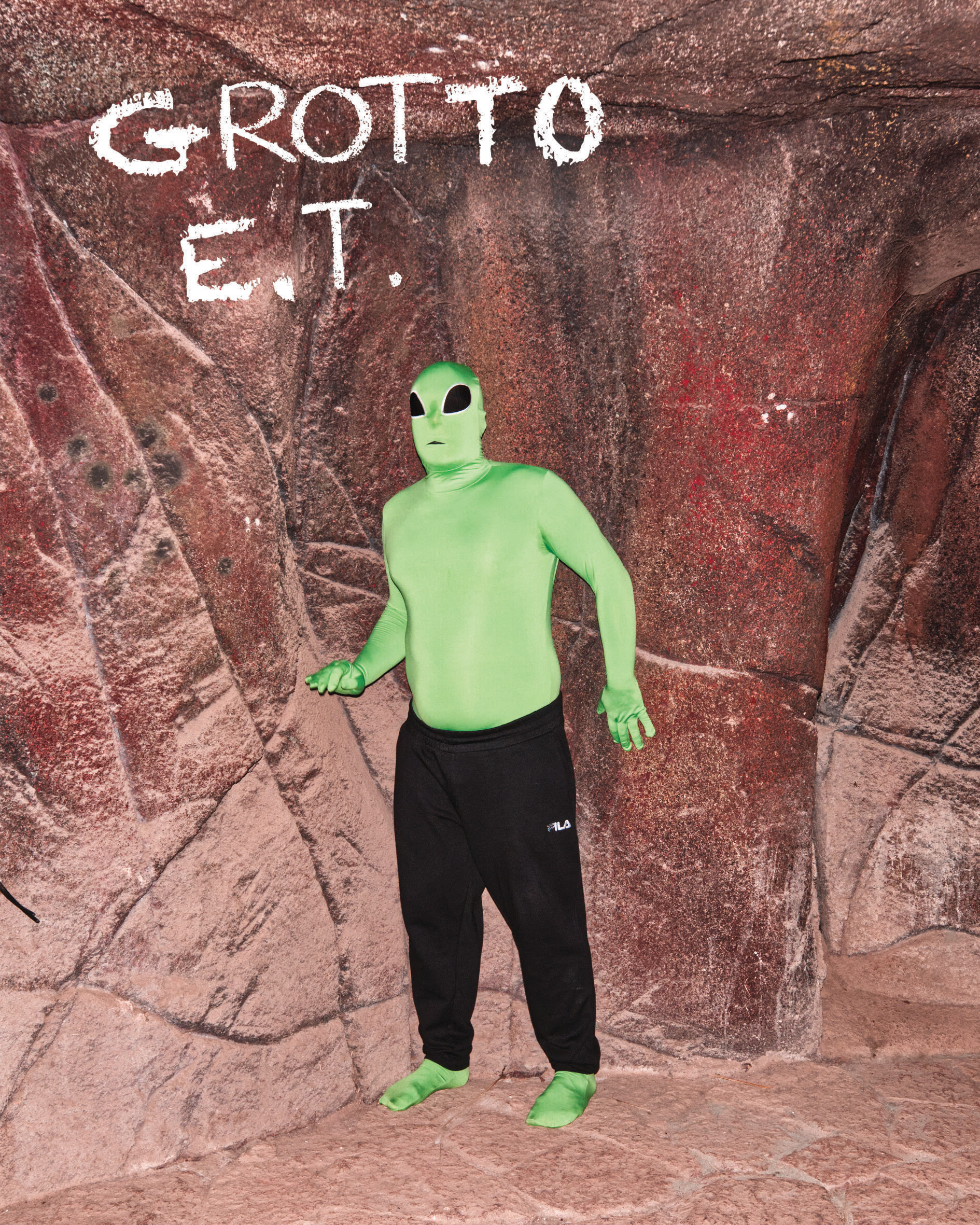 Alien-figuren i grotten er udstillingens omdrejningspunkt. Men vi ved ikke, hvem han er, hvad han laver, hvorfra eller hvorfor han er kommet. Udstillingen låner sin titel fra den klassiske science fiction film E.T., ligesom performeren, der inkarnerer alien-figuren i grotten, også låner inspiration herfra.