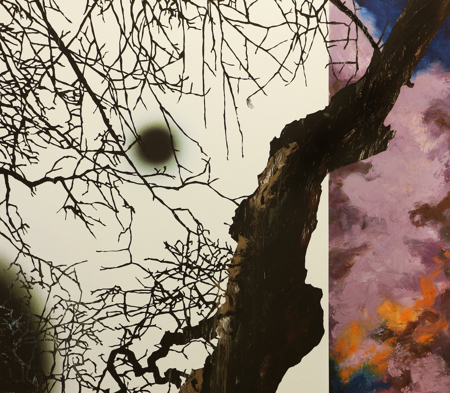 Maleriernes collageagtige kompositioner vækker på én gang fornemmelsen af et splintret og uendeligt rum. Himlens sort- og