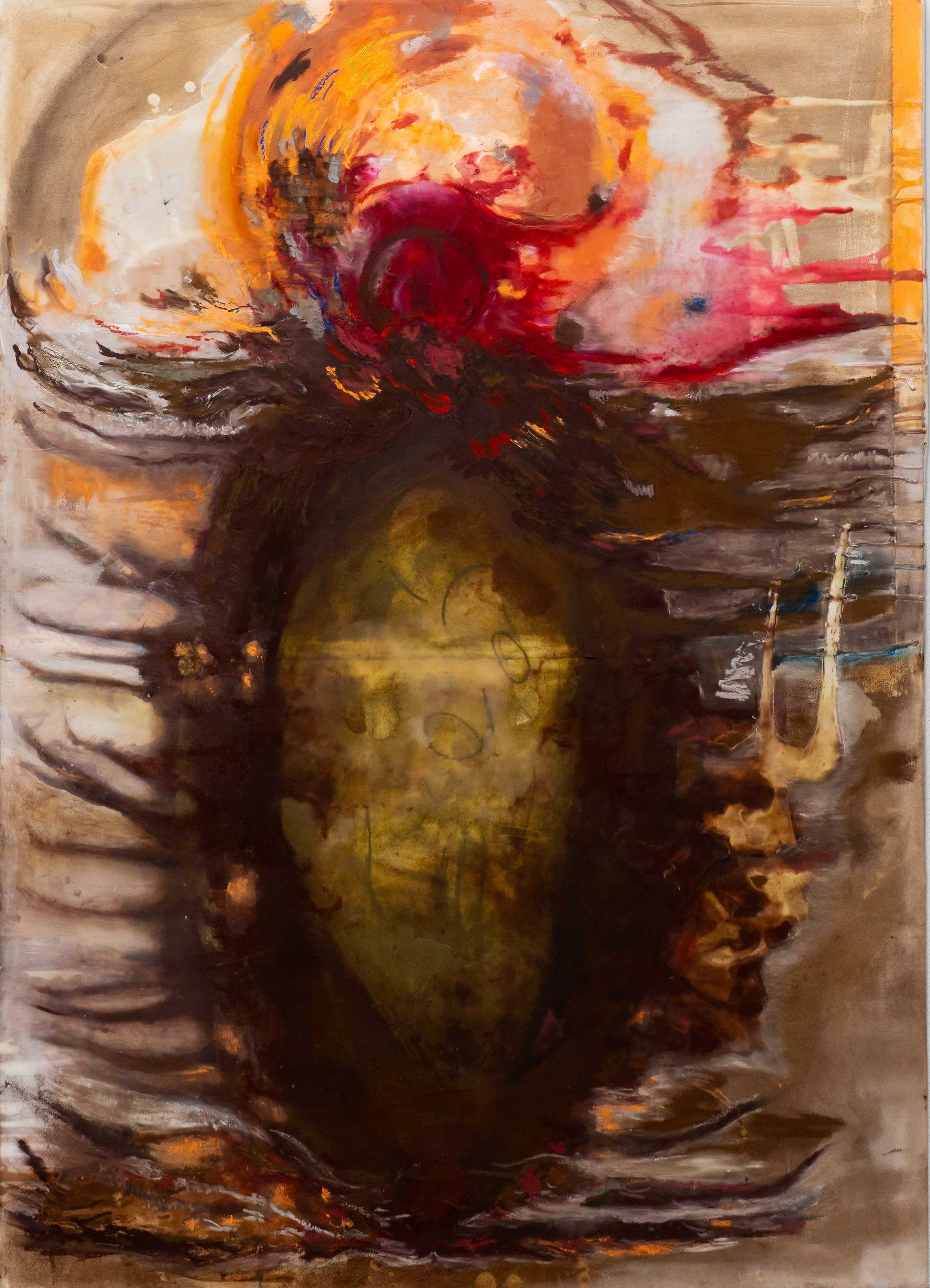 Nadia Gueddouhs (f.1991 DK/DZ) maleriske praksis tager sit afsæt i kroppen, i farvens stoflighed og den sanselige erfaring forankret i det materielle og det præ-sproglige med rødder fæstnet i grottens og hulens inderste dyb. Herfra åbner værkerne sig i en vibrerende, svulmende cyklisk og rytmisk bevægelse via kroppens urnatur og materialernes immanens mod en kosmologisk rumlig uendelighed og samhørighed.