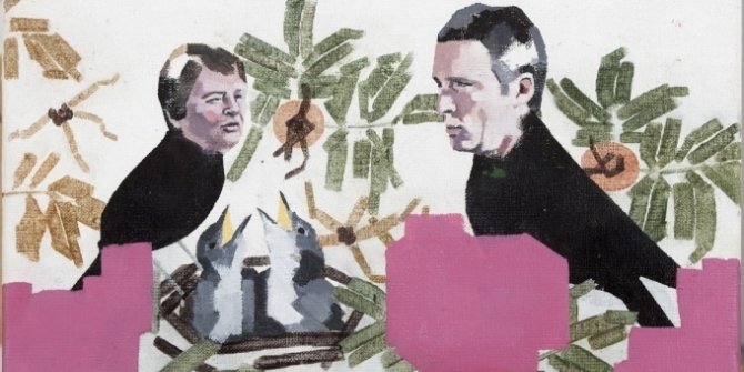 Tydeligvis skaber den surreelle sammenblanding af fjerdragt og ansigtsudtryk en forbindelse til fugles instinktive træk og menneskets bevidste ageren – som i maleriet af politikerfuglene Anna Lindh og Olof Palme (Terapi 2, 2012), hvor de to ses smilende på kanten af en rede med fugleunger, der venter på føde. Hovedfigurerne har ingen orme i munden, men udstråler alligevel omsorg og velvilje. Uundgåeligt påvirkes vi af bevidstheden om de virkelige toppolitikeres skæbne, hvilket giver fortællingen et melankolsk præg. Og dette i et aftegnet landskab, hvor baggrundsfarven er uskyldsren hvid.