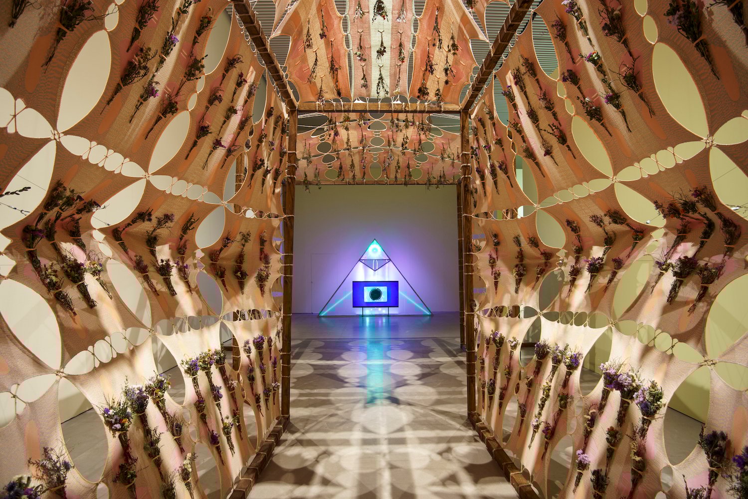 Også Tabita Rezaire og Yussef Agbo-Ola tænker deres – i øvrigt meget fine og æstetiske værk – som ‘funktionelt’ og helbredende. De har skabt et tempel med stofvægge beklædt med sirlige buketter af tørrede medicinske planter, og der er magi i at bevæge sig gennem templet, som fungerer som en passage i udstillingen. Men lydsiden (komponeret af Agbo-Ola) får ikke værkmæssig mening i udstillingsstøjen, og duftoplevelsen har svære vilkår i gennemgangsrummet.