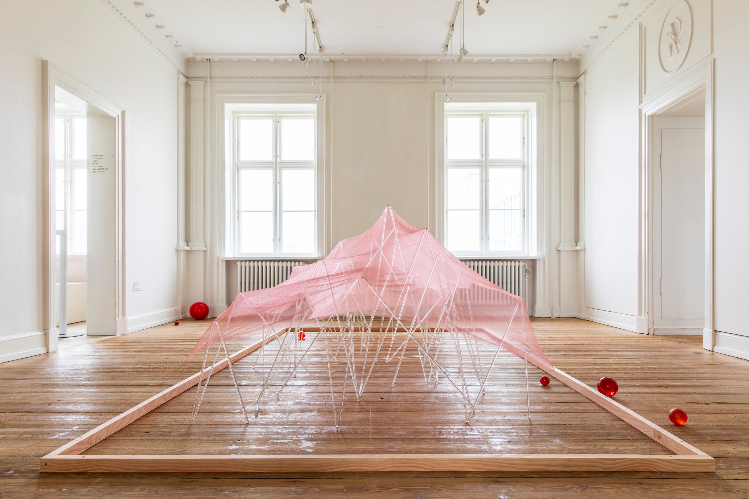 Tove Storch, Uden titel (teltet), glas, silke, tråd, træ, 2024. Foto: Kasper Palsnov/Glas