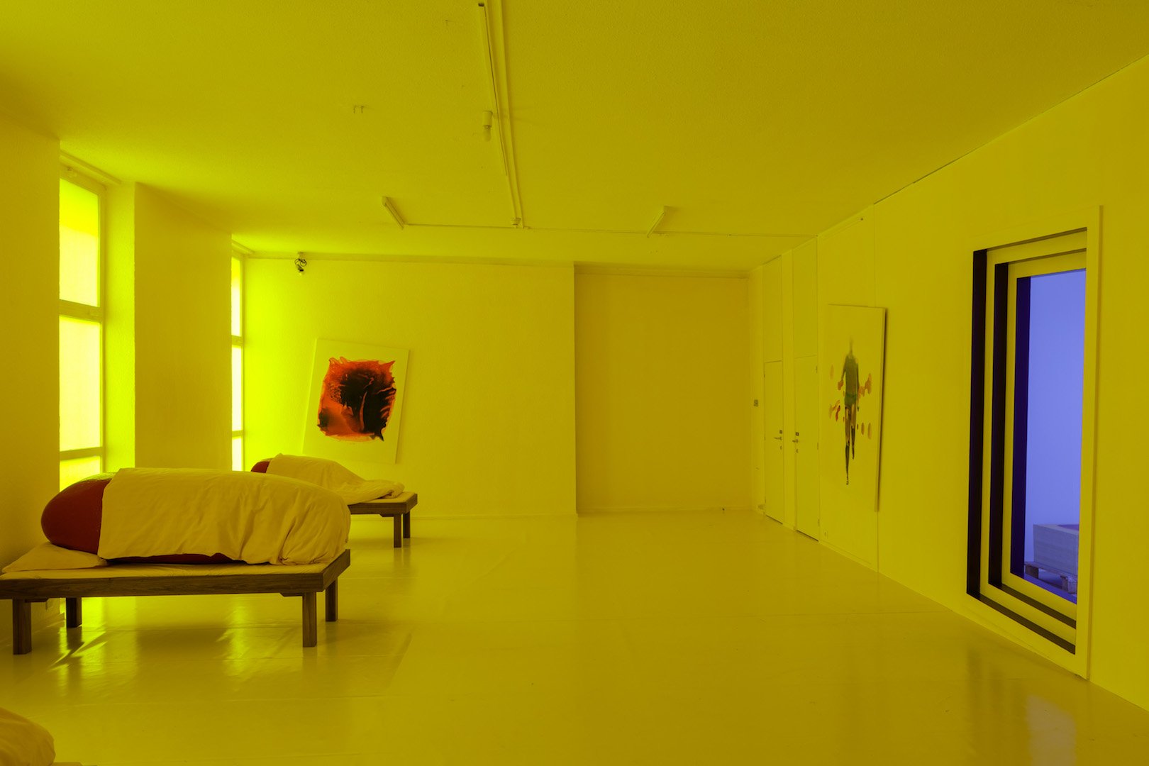 Det har eksempelvis slået mange, at han så ofte anvender den gule farve. Den, han har i spil, er en såkaldt basisfarve, der bruges til at blande andre farver med, fortæller han. Ved flere motorcykeluheld, hvor han mistede bevidstheden, har han oplevet at befinde sig i et helt gult, indre rum. Derfor repræsenterer denne farve noget sygeligt eller midlertidigt uvirkeligt. For beskuerne giver det desuden en fornemmelse af vægt- og konturløshed, synes jeg, med disse store gule rum – både i installationer og i billedernes malede rum.