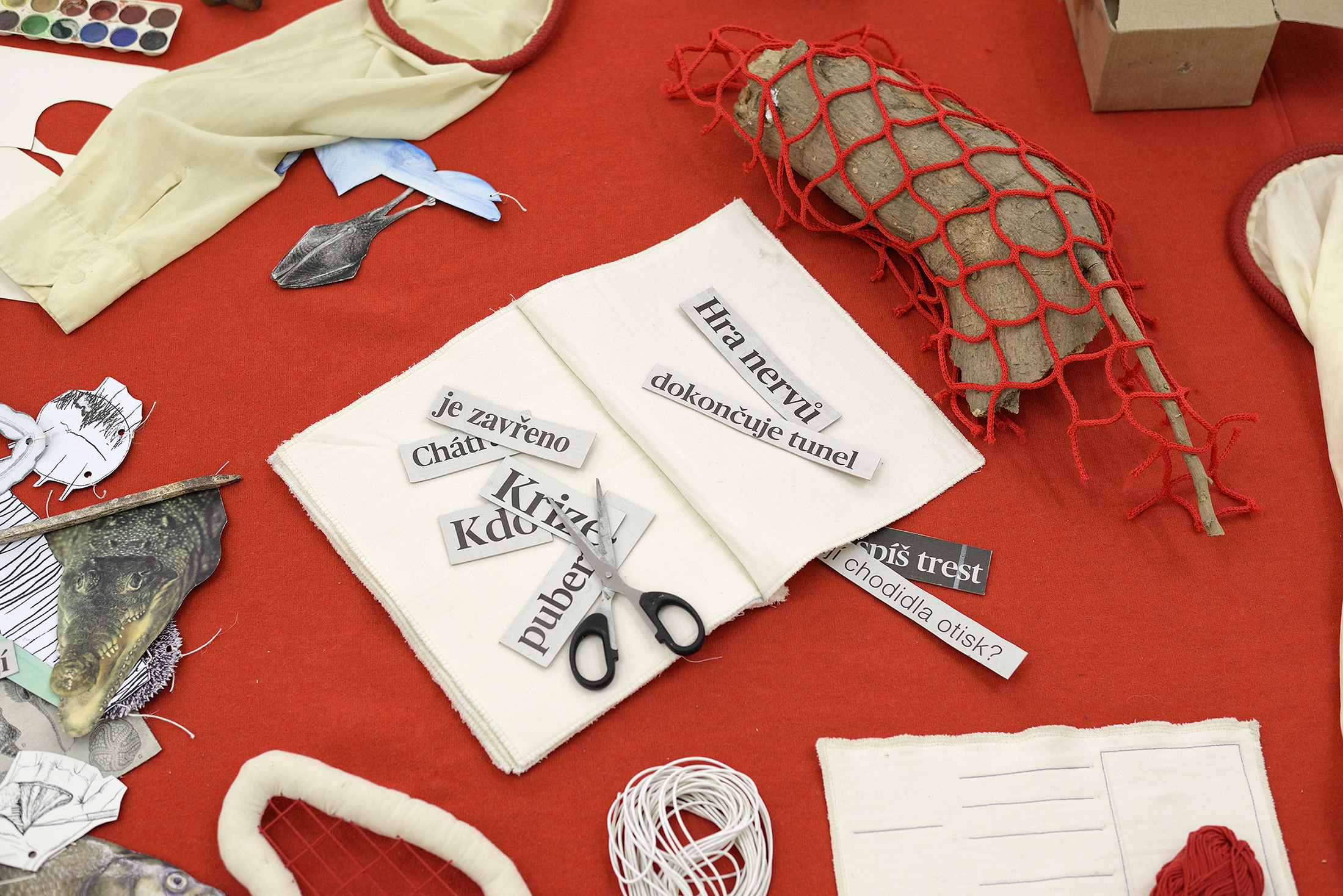 Langs væggen står en meget stor saks, som kan være årsag til de afklippede stof-lemmer, men selv om den qua sin størrelse er ganske truende, så er den alligevel også del af den proces, der kobler og forener de afklippede lemmer.