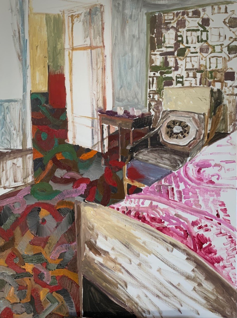 Aflyste rejser og annullerede møder, fester og middage. Karantænen er for mangen en kunstner ensbetydende med et tilbagetrukket liv som en munk i kloster. Men det giver tid og ro til at arbejde i dybden. For Erik A. Frandsen har pandemien betydet, at han har isoleret sig hjemme i lejligheden på Fælledvej og i gården på Falster. Han har med andre ord hentet de nye motiver i sine nære omgivelser ligesom hans ældre kvindelige kolleger gjorde det i tiden før kvindernes frigørelse.