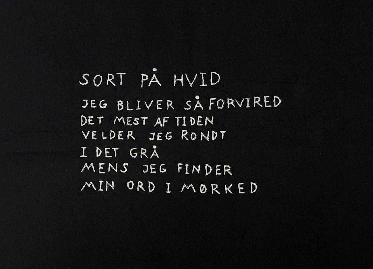 Julie Nords papirarbejde Primavera (forår) tager os med på en grotesk dødsvandring gennem haver, stuer og natur. Henrik Mennés tegnemaskine Tegningssystem TRK1 spytter spøgelsesagtige corona-motiver ud dagen lang, mens Gudrun Hasle broderer sig igennem krisen med digtet Sort på hvid på sit karakteristiske ordblinde lingo. Mie Mørkeberg skildrer en ung kvinde, der med lukkede øjne vandrer gennem foruroligende mørkt vand, fyldt med ildevarslende, sort vegetation.