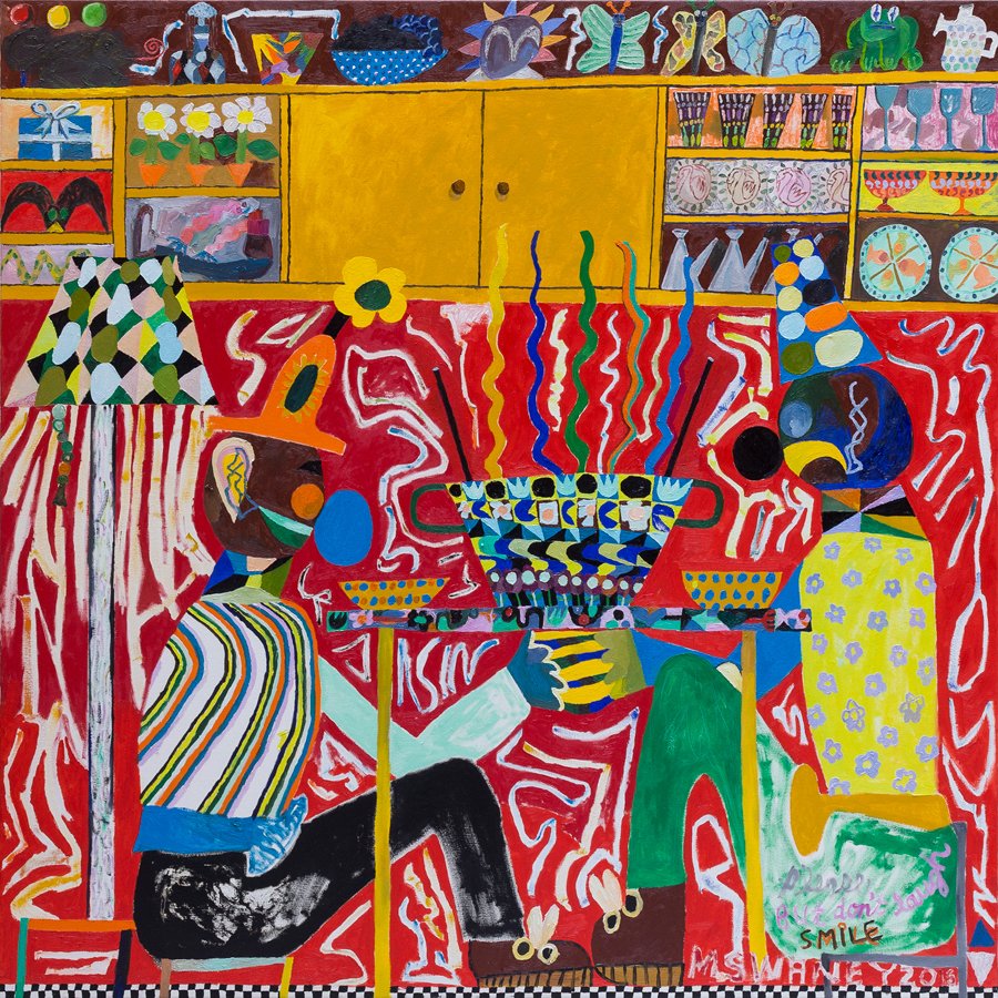 Michael Swaney gæster Charlotte Fogh Gallery med et farvestærk og fabulerende billedunivers, hvor stilistiske, naive figurer med klovnenæser næsten ‘forsvinder’ i myldrende, detaljerede og mønsterede overflader. Udstillingen hedder Papishio, som er et caribisk udtryk for ”nonsens”, og Swaney følger den stærke disposition, der driver mange kunstnere til at finde værdierne hinsides fornuften i det barnlige, det umiddelbare, det skæve.