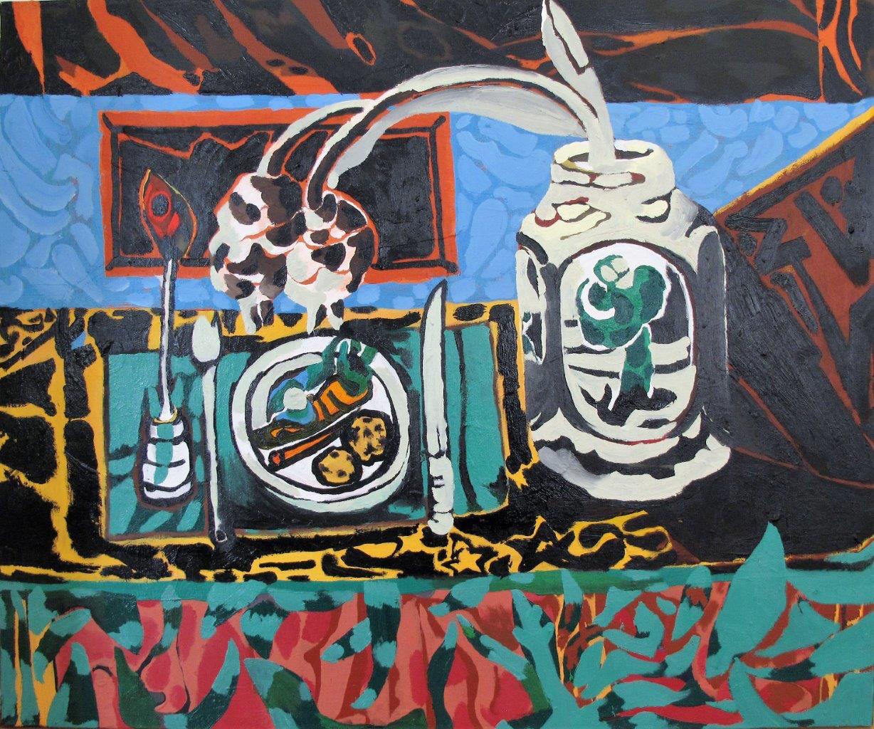 Så går turen til Galleri Profilen, hvor man umiddelbart studser, når man træder ind i udstillingen Land og By med Martin Fraenkel. Jo, her er billeder, der på postmodernistisk vis sampler eller trækker på kunstnerens graffiti-baggrund. Så er man på nogenlunde sikker samtidskunst-grund. Men det mest overraskende er, at den overvejende del af udstillingen består af ‘rene’ opstillings- eller landskabsmalerier. Tilsyneladende er de ‘uden’ fortællinger eller symbolik – og bestemt uden ironi! Ekspressivt er der kun lettet lidt på speederen for at holde et fokus på mønsterdannelser på fladen. Her kan man sammenligne med Swaney. Men stort set er der malet med fart og fede pensler, og det er ‘dekorativt’ og ‘primitivt’ som Matisse for 100 år siden – bare noget mere brutalt. Hvad vi skal med denne slags malerier i dag, er jeg ikke helt sikker på, og Tal R må regnes for en akademisk maler i sammenligning. Men Fraenkel sparker eddermame til fantasien om ‘autentisk’ skaben og feberdrømmen om, at et maleri ikke har andet formål end at være et maleri.
