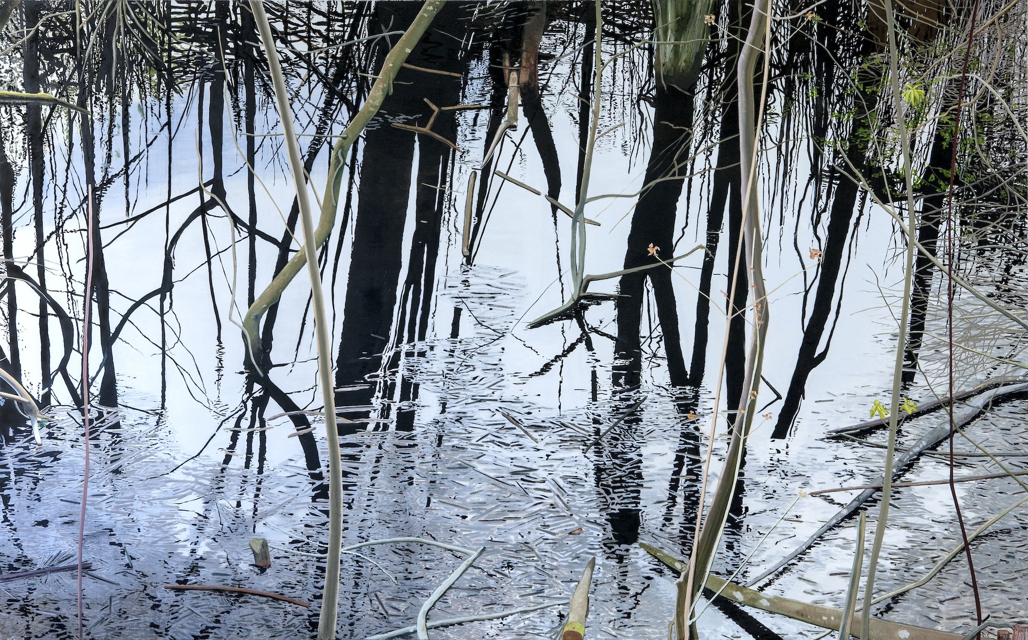 Billedet er en replik til Sorø Kunstmuseums guldaldermaleri Japetus Steenstrup og Frants Jacobsen på ekskursion på Flommen, som Hans Georg Harder malede i 1840-45. Dette engområde uden for Sorø er i dag fredet. Her er der en ellesump, hvor røde elmetræer vokser og slår rod i det mærkeligt sorte mosevand. Dette sublimt malede motiv med træstammer, grene og lange, tynde stængler med blomster er hovedsageligt spejlet i vandoverfladen.