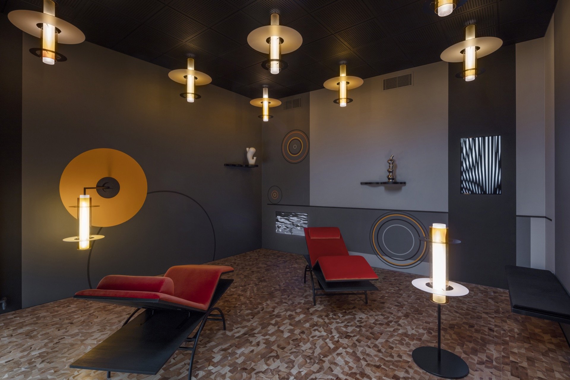 At udsmykningen er så total, har blandt andet betydet, at alle vægge har været nede, for at skærme og højtalere kunne bygges ind i væggene og for at forstærke konstruktionerne indvendigt, så de kunne bære de tunge skulpturer og lampearmen til en tung lampe.