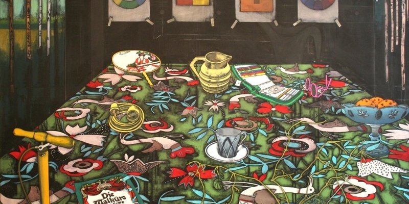 I maleriet Dialekt skuer vi over spisebordet med al dens flora og klare farver.