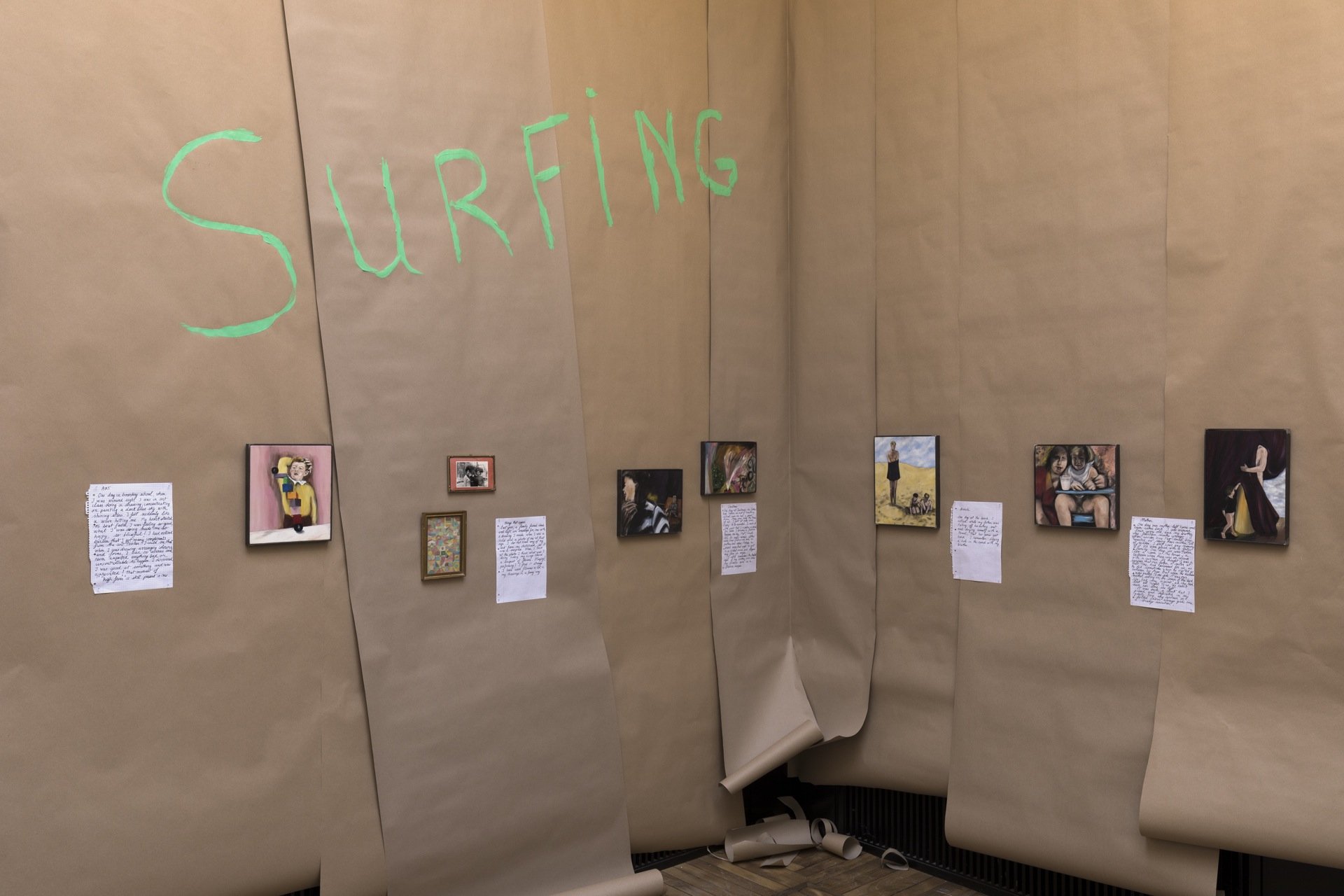 Indledningsvist, i forrummet, hænger baner af brunt papir som skødesløs baggrund for håndskrevne, personlige fortællinger. Jeg har ingen grund til at betvivle, at disse fortællinger er sande. Kunstneren har valgt at delagtiggøre den udstillingsbesøgende om hændelser i familien og udfoldelse af seksualiteten. Her er omridset af de begivenheder, som gjorde denne person.