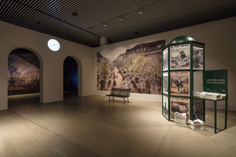 Udstillingen var opbygget som en rejse gennem tid og sted. Først kom man ind i et rum, der forestillede byen med en enorm fotostat af Pissarros Boulevard Montmartre, en bænk og en reklamesøjle med gratisaviser. Næste rum illuderede en banegård, ligeledes med en kæmpefotostat, en vægprojiceret stumfilm, og et ur, hvor tiden gik baglæns. Dernæst blev man ført ind i en lang, mørk korridor, der forestillede en togvogn. På væggene i begge sider af togvognen var der en række “vinduer” med videoskærme, hvor udsnit af impressionistiske landskabsmalerier panorerede forbi, som om man stod i togvognen og kørte gennem landskabet.