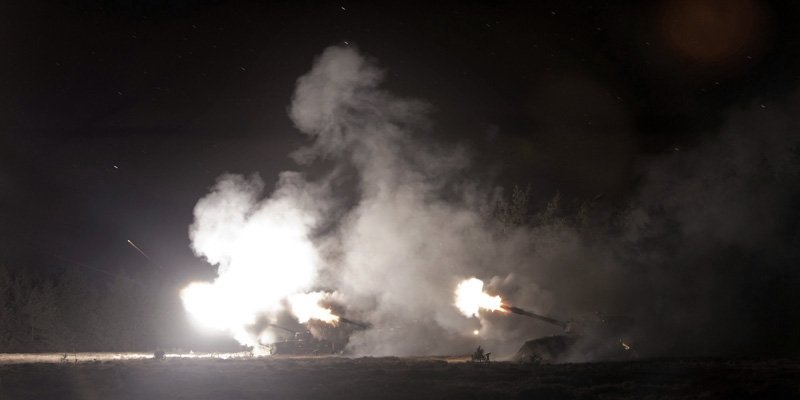 Krudtrøgen kan smages i luften og trykket fra affyringen af forsvarets 155 mm haubitskanoner kaster kviste og bark op i luften, når Morten Barker løber rundt med sit kamera og skaber kunst.