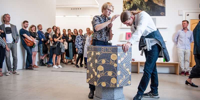 Foruden malerierne udstiller han en døbefont i bornholmsk granit med indgraverede ornamenter i bladguld og med indskriften: Credo quia absurdum. Dvs. jeg tror, selv om det er absurd. Flere af gæsterne under ferniseringen blev døbt af Alexander Tovborg, som indviede dem i kredsen af ”Troens Riddere.”